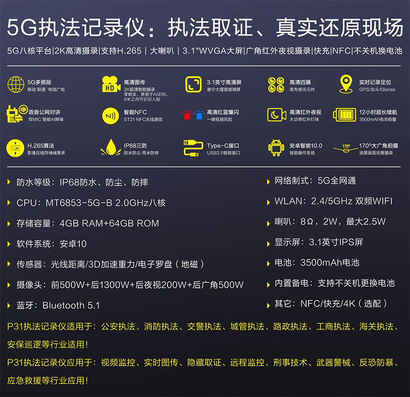 5G智能執(zhí)法記錄儀在錄像機,視頻,5G執(zhí)法記錄儀的基礎(chǔ)上,通過硬件和軟件系統(tǒng)的升級優(yōu)化的研究和開發(fā)和推出了實時高清視頻通信功能的4 g個別執(zhí)法設(shè)備,支持高清實時雙向音頻和視頻通信,衛(wèi)星定位,集群呼叫,高清視頻存儲、雙模式定位、外部相機移動業(yè)務場景執(zhí)法功能。