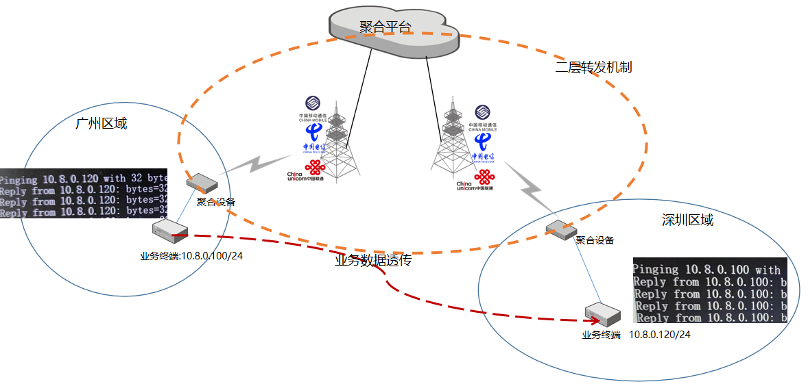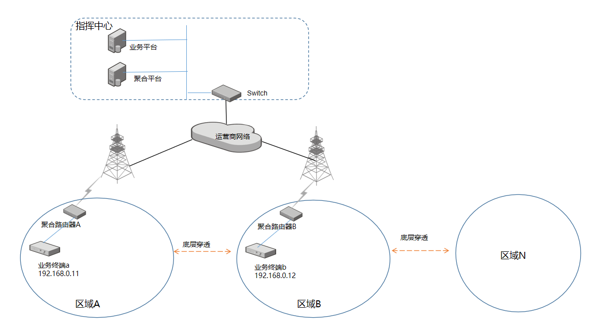 本應(yīng)用場景主要通過聚合通信的底層穿透功能,實現(xiàn)多個下掛業(yè)務(wù)終端間的類自組網(wǎng)式應(yīng)用。